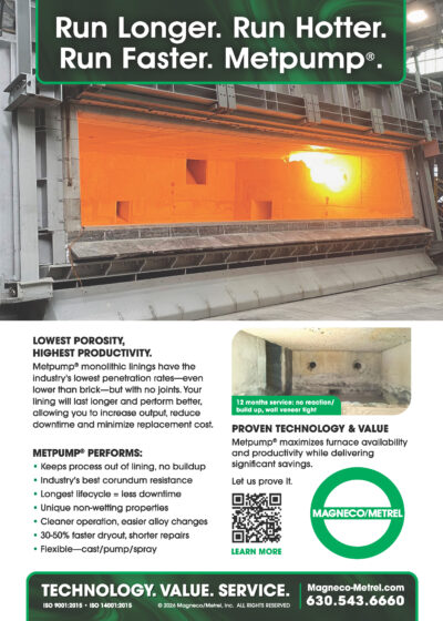 Magneco/Metrel has the material, equipment, skilled operators, and knowledgeable onsite personnel to assist with complete furnace relining, cold/hot repairs, and related equipment relines. Metpump® is ideal for use in box type, open well, top charge, multi-chamber, rotary type furnaces, and surrounding areas.